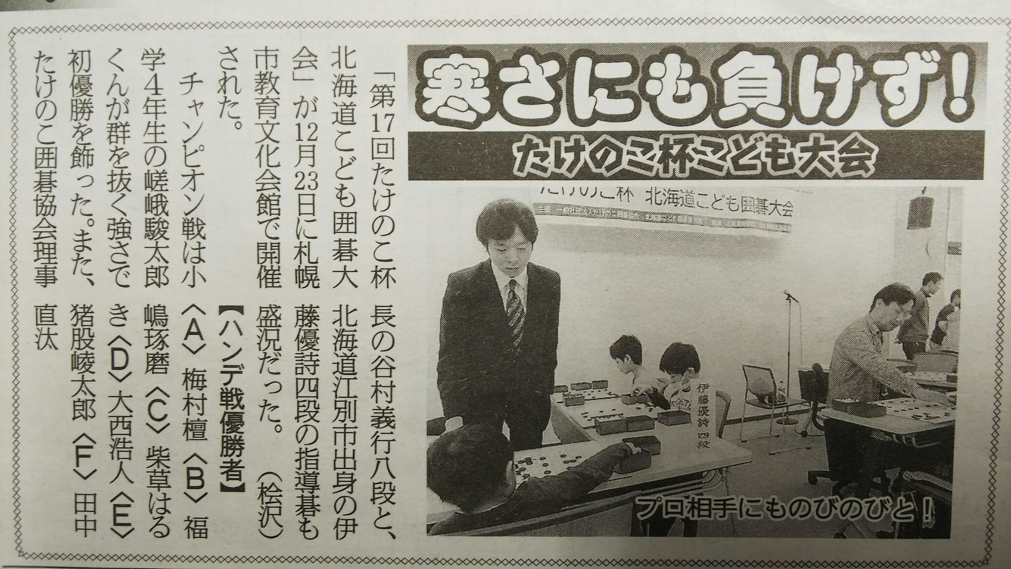 週刊碁に昨年12月23日に札幌市で開催した「たけのこ杯北海道こども囲碁大会」の記事が掲載されていました。