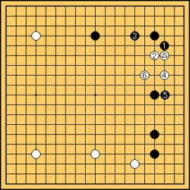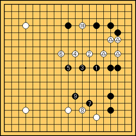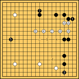 正解!黒は 〜 と5手も使って、たったの15目しか増えていないんだよ。これじゃぁ、とても攻めの効果があがったとは言えないよね。実は白の が追いつかない石で 〜 がその石を追いかけているから黒が良くならないのは当然なんだよ。 |