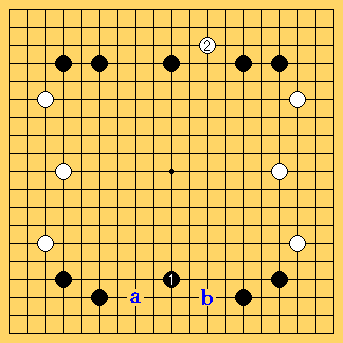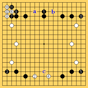 もう、たよりないんだから…。下辺は左右ともケイマ受けだよね。ケイマ受けは安定性重視で発展性はない受け方なので白に下辺へ打たれても響かないし、位が低いので発展もしないということで下辺は大場ではないんだよ。 と打ってもaやbの打ち込みが残るし、 と打ち込まれると発展性のある上辺まで失ってしまいそうだよね。