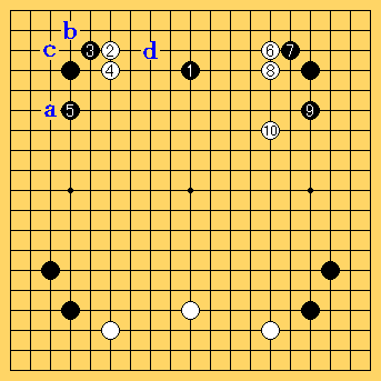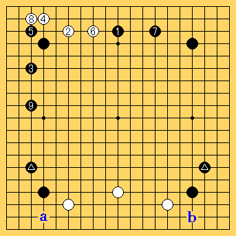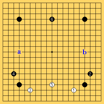 さすが〜!aやbがつまらないことに気づいたのは立派だね。「左右同形中央に手あり!」も身についているようだし。でも、この格言の本当の意味は 、 と全部ケイマに受けたらaやbの三連星はもちろんだけど、それ以外の辺も三連星を打たない方が良いってことなんだよ。