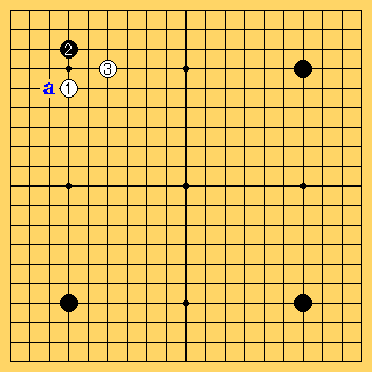 と、言うことは白は と高目に打てばaのシマリを打たなくても隅を地にすることができるわけだ。これじゃぁ3子のハンディなんてすぐに無くなってしまうよ。だからひろみちゃんのようにaとカカルのが怖い人ほど、最初にaとカカルべきなんだよ。最初にカカルのが一番安全だからね。