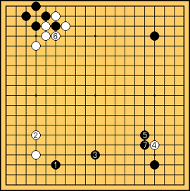 そこで が効果的なシチョウアタリになるってわけさ。 は仕方なく と打てばどうだい?最初にシマルよりももっと黒が有利だろ。 |