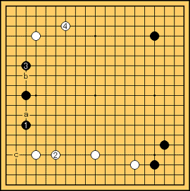 確かに安心だね(笑)でも、ワリウチはほおっておいてもどちらかにヒラクことができるから慌ててヒラク必要はないんだよ。この場合は白aが大きいので は良いとしても はどうかな?白にbと打たれても黒cのスベリで心配はないよね。 |