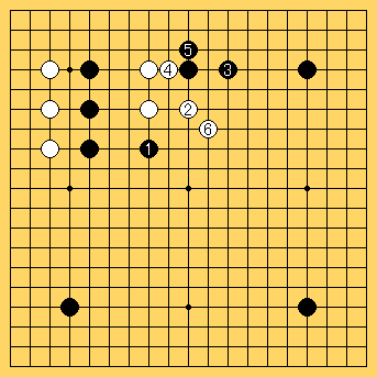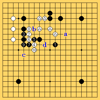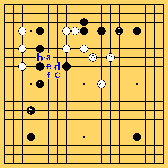 そう、よく気がついたね。 で攻めは一段落とみて黒は の補強が大切な一手なのだよ。 があれば白aには黒bのツギで白c以下符号順に黒fで心配ないからね。「攻めた後には必ず補強!」の意味が理解できたかな?