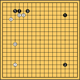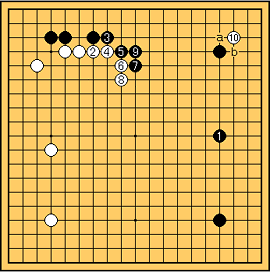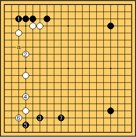 次に黒aと打ち込めば左辺は簡単に荒らすことが出来るので白は と守るくらいかな。後は左辺が発展しないように のカカリから と安定すれば黒に不満はないよね。 |