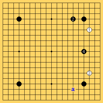 そうだろう、白は前図のように打てば富士山型にすることは可能なのだよ。なのにあえて と打つ目的はただひとつ、黒に富士山型を阻止させて乱戦に持ち込もうと言うことなのさ。だからたとえ攻めるのが目的でも右辺に打ち込むことは黒が右上を一間に受けた上辺重視の目的とも反する考え方なのでやめたほうが良いかも。 〜 と打たれてもたいした地ではないしね。