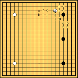 ちゃんと教えてあげるからそんなに怒らないでよ。 のカカリの応手はまず反対側に受ける手がa〜dの4通り、ハサミがe〜jの6通り、中央に発展させる手がk〜mの3通り、隅のスベリを防ぐ手がn〜qの4通りと何と17通りあるのだよ。 |