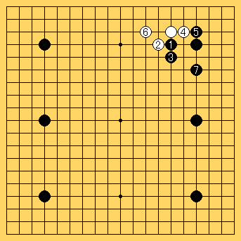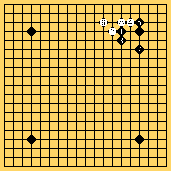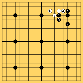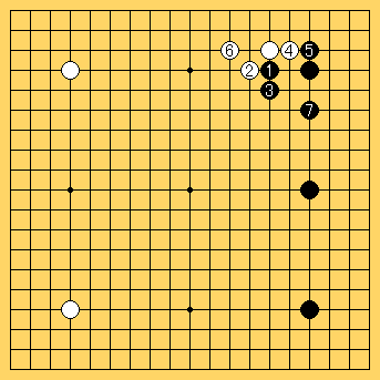そうなんだ。でもさっき勉強したツケノビの目的が理解出来ていれば大丈夫だよ。じゃあこれからいくつか問題を出すから考えてみてね。この場合(四子局) のカカリに 〜 とツケノビるのは良い手、悪い手どっちだと思う?