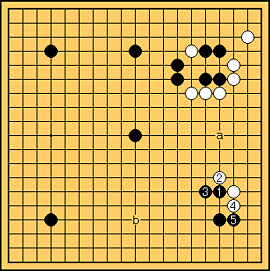そうだろう、どうしてそうなってしまったかと言うとひろみちゃんは右辺の黒(a)を捨てる方針なのにその捨てる石を意識してしまったからなのだよ。どうせ捨てるのであれば小さく捨てようなんて考えずにその石(a)がないものと思って次の手を考えてご覧。