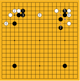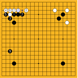 のツケに対して黒aの押さえは上辺重視の定石なのだけれど今回のように上辺がつまらない場合は黒a以外の定石も知っておかないと困るよね。