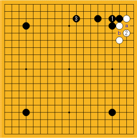 と黒のキズを防ぐのが大切な一手!白も次に黒aやbと打たれると困るので