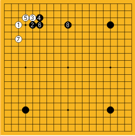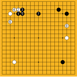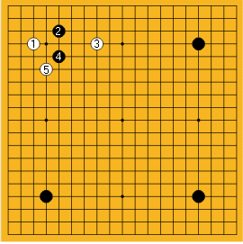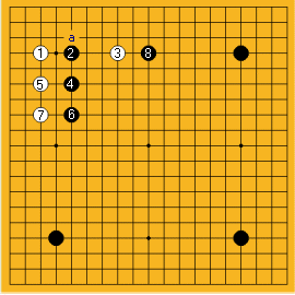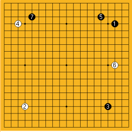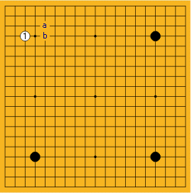 この場合は 〜 のツケヒキ定石から のヒラキがピッタリだから少し黒が問題かな。右上のシマリの向きだと上辺の価値は低いよね。左上で白に実利を取られ価値の低い上辺にヒラキを打たされることが黒は辛いのさ。