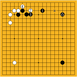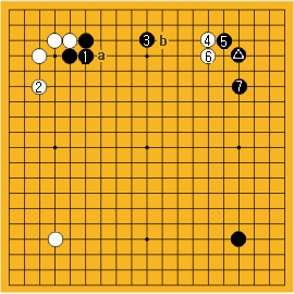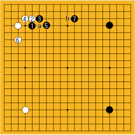 で白が苦しいから多分やらないよね。だからこの局面では黒aからbと一路広くヒラキを打つメリットは全くないと言うことだよ。